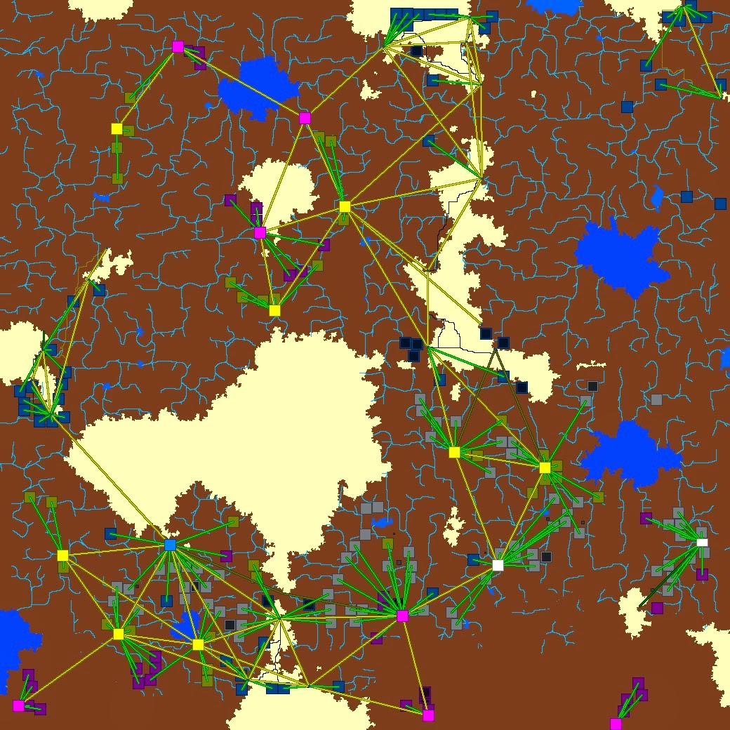 The Wereashes Fortress (goblin, bright purple square) by the inland ocean has a link running northeast to the dwarven fortress, Drilledguilds, Interestingly, Drilledguilds has a population listing 108 goblins and 107 dwarves. According to the site history, both goblins and dwarves have settled there and both have settled, got a job, married, had children. Some goblins have even migrated to other linked dwarven locations.