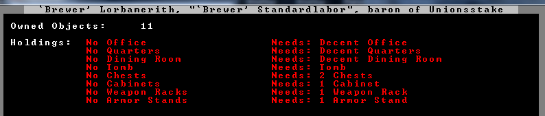 Apparently, 'Brewer' Sandardlabor (Lorbamerith) had noble relatives in Unionsstake, who have passed away. That means I now have a noble with demands to deal with, along with his wife ('Cook' Eddudalath) the consort of the baron.