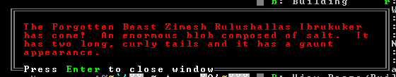 9th Limestone - The forgotten beast Zimesh Rulushallas Ibrukuker has come! A giant blob of salt... fortunately it is down in the cavern layers where it can't get into the fortress.