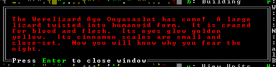 6th Moonstone - Fikod goes on a rampage as a werelizard, far away from the meeting hall where all the war dogs are stationed... she kills 'Woodsy' Zulban Dmuatbasen in a bedroom, but since there are doors everywhere, is content to just sit around because she can't see any new victims.