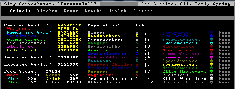 Furnacelull is now a city and created wealth is about 6.5 million. The drink stocks are at 1200, which is roughly 10 drinks per dwarf.